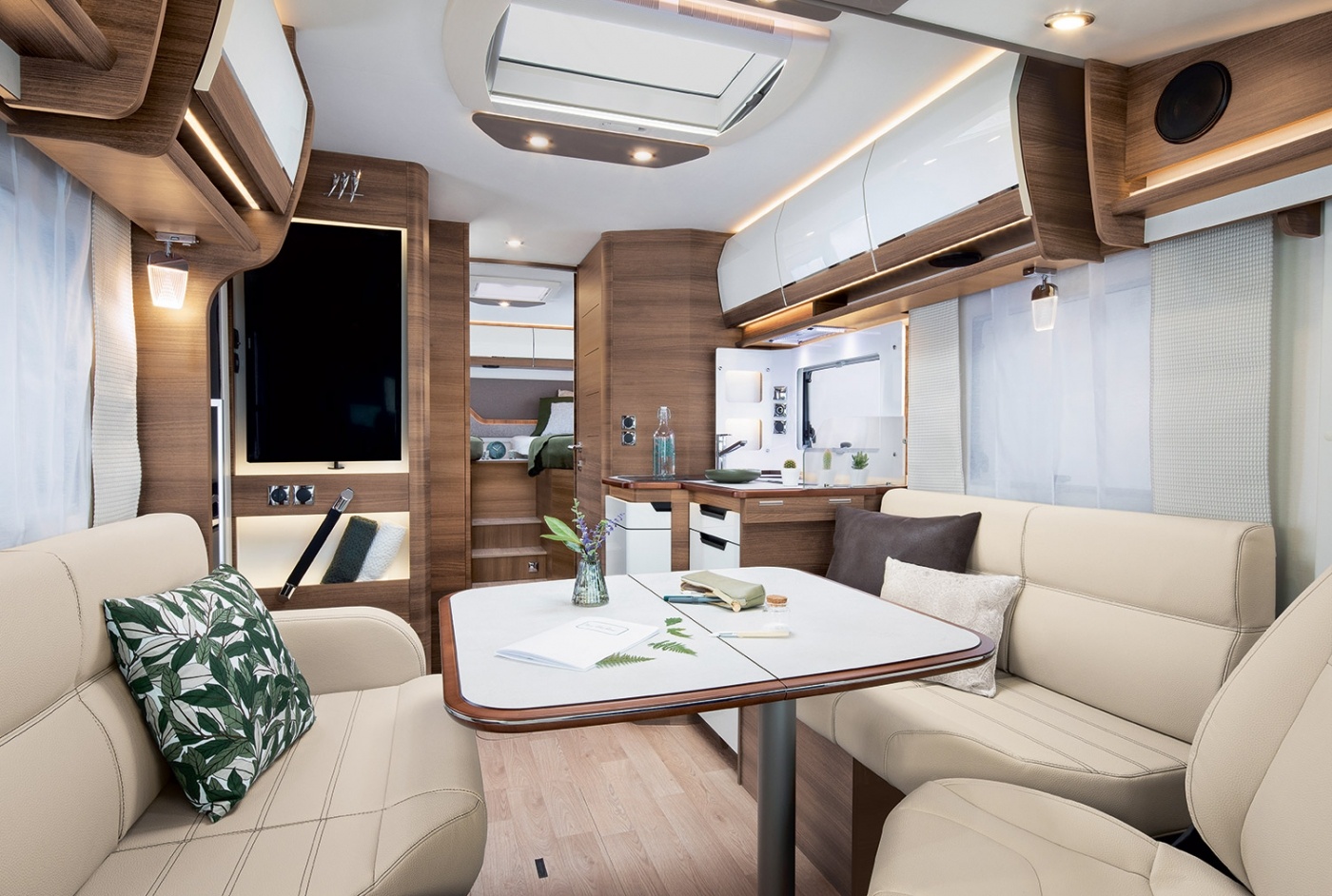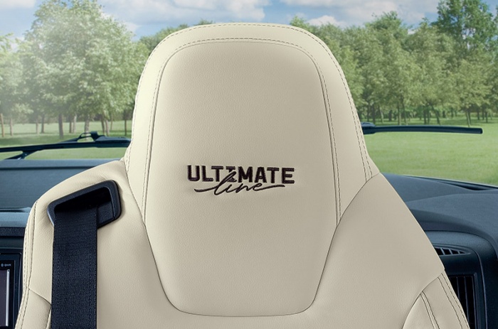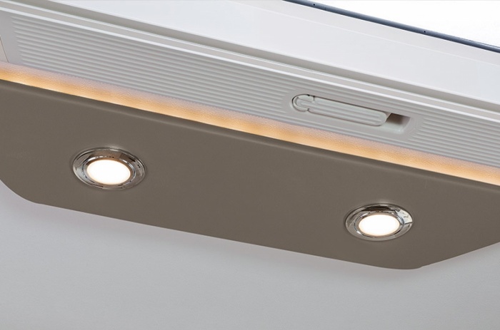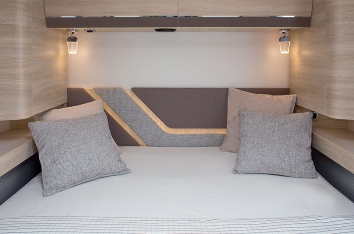 Nada más entrar, se puede apreciar el estilo: bordado ULTIMATE LINE en el reposacabezas de los asientos de cabina y nueva tapicería TEP* con pespuntes MILAN. Las claraboyas del salón y el dormitorio también cuentan con un nuevo revestimiento TEP* retroiluminado.
