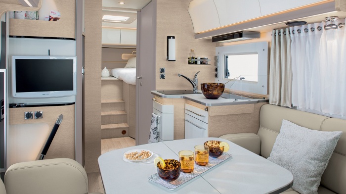 En cuanto al ambiente, la Serie M se ofrece un nuevo ambiente inédito llamado DUNA, con colores cálidos y líneas modernas, lo que se ve reflejado en las líneas horizontales de madera. Una verdadera renovación en el mundo de los vehículos de ocio. El salón dispone de dos banquetas frente a frente, provistas de reposabrazos, que sirven al mismo tiempo de reposacabezas durante la nueva transformación del asiento en sentido de la marcha.