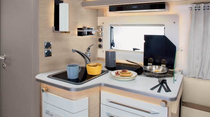 El área de la cocina vuelve a presentar las características de RAPIDO con los frontales de los cajones de color blanco brillante con colgadores, así como con la retroiluminación. El hornillo de tres fuegos ha sido sustituido por un hornillo de dos fuegos de serie, para una mayor funcionalidad en la vida diaria, que puede ser reemplazado por un hornillo de tres fuegos opcional. Por último, la nueva Serie M incorpora un nuevo extractor de humos con parte frontal de diseño y táctil.