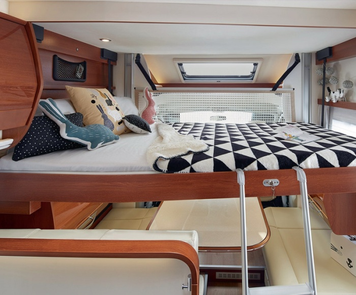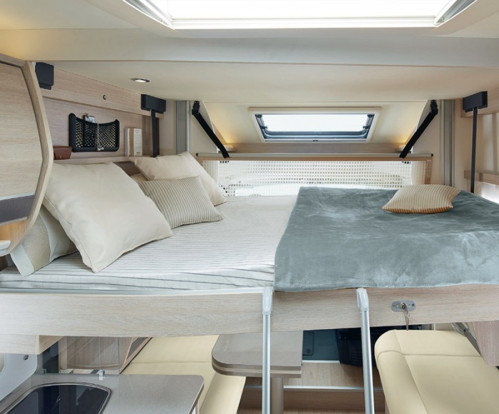 Todas las perfiladas RAPIDO están disponibles con la opción de cama de techo eléctrica. Además de su aspecto práctico y el aumento del número de plazas para dormir disponibles, se ven modernas y de diseño. El revestimiento ha sido completamente renovado a favor del nuevo diseño, integrando iluminación directa e indirecta.