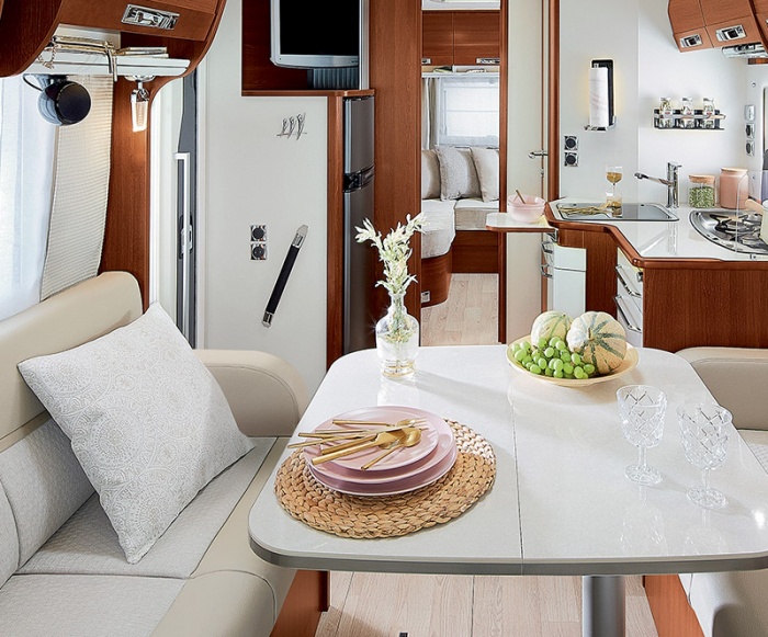 Finalmente, para un confort aún mayor, los salones con banquetas frente a frente en el chasis AL-KO están equipados con reposabrazos (uno o dos, según distribución). Los modelos i165, i190 i1066 e i1090 disponen de espacio de almacenamiento adicional bajo la mesa del comedor. El espacio está optimizado a la perfección.