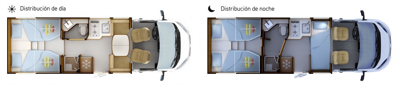 Con sus 6,99 m de longitud, se maneja fácilmente y ofrece un interior espacioso y luminoso gracias a su nuevo mobiliario AURORA, en tono madera clara, y a su SKYVIEW panorámico.