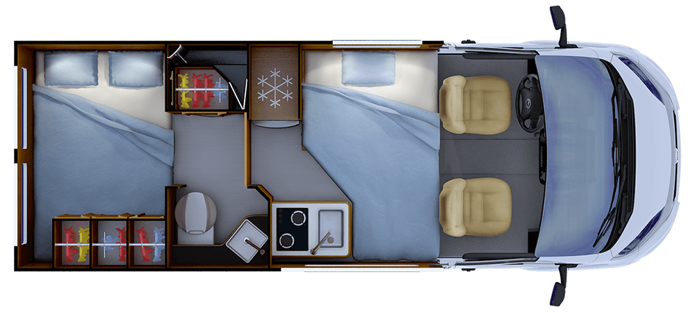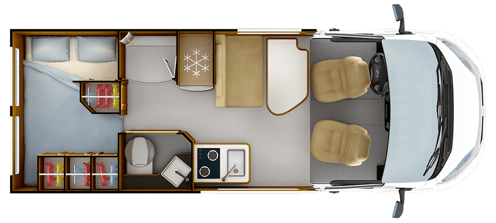 • Espacio de almacenamiento bajo los muebles de cocina con cajones cuberteros y caceroleros, revestimiento interior de PVC de alta resistencia, cierre centralizado eléctrico y alarma al arrancar el motor en caso de no bloquearse