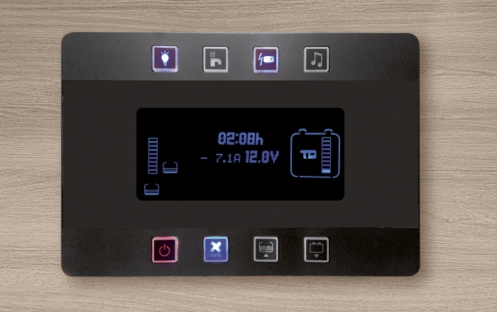 Esto significa que el uso de la electricidad de su autocaravana ya no estará limitado a la energía de sus baterías, ya que éstas están conectadas a una fuente de energía más potente (de ahí la corriente de carga positiva). Por tanto, como las baterías se recargan continuamente, no se puede mostrar la autonomía restante de la batería.